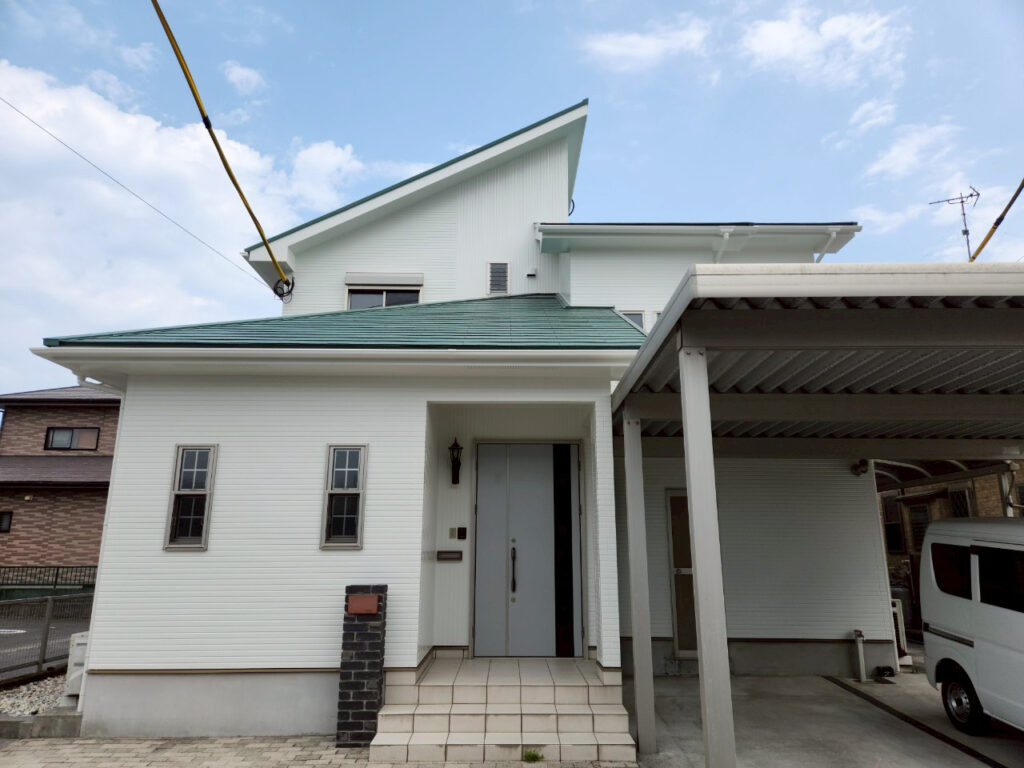 鹿児島市 外壁塗装工事|白い外壁とグリーン屋根で明るい印象に